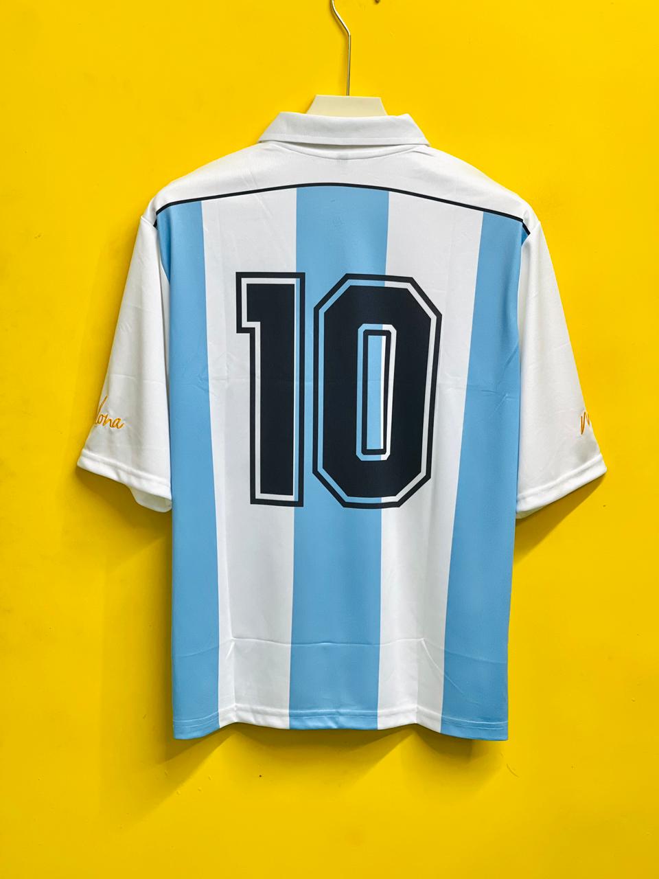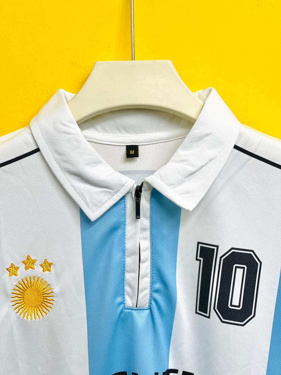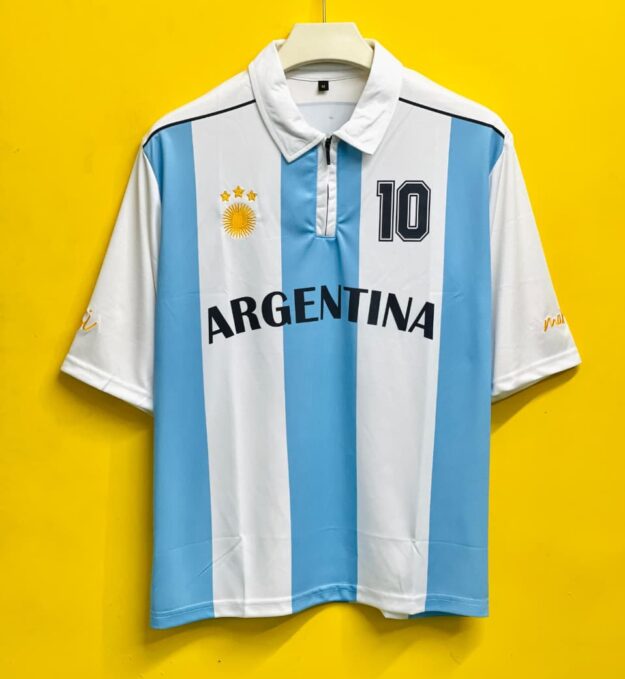 Show your passion for football with this stylish Argentina No. 10 Jersey. Designed with the teamโ€™s signature sky blue and white stripes, this jersey combines tradition with a modern twist. The premium fabric ensures comfort and breathability, making it perfect for match days, casual outings, or training sessions. Featuring a sleek collar design and bold number print, itโ€™s a must-have for every true fan.